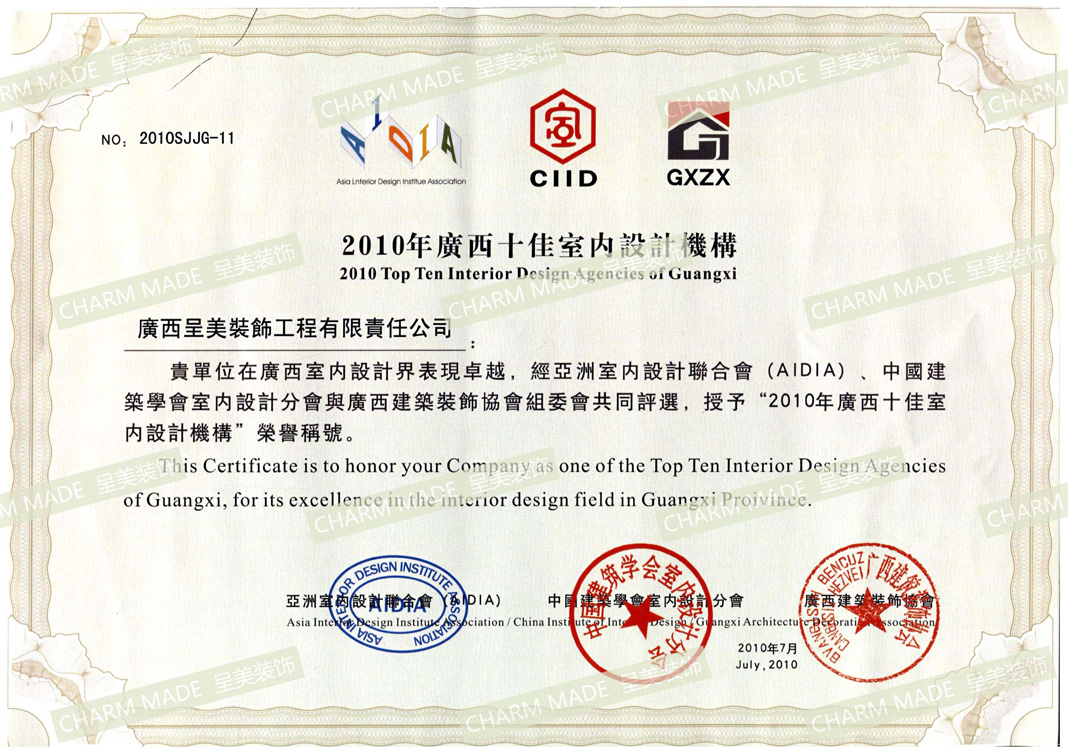 2010年 廣西十佳室內(nèi)設(shè)計機構(gòu)