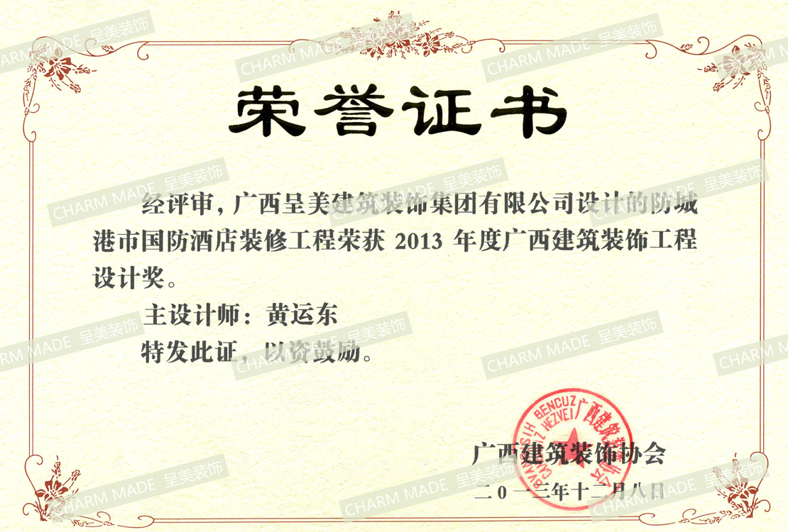 2016年度廣西建筑裝飾工程優(yōu)質(zhì)獎(依山伴水酒店項目)