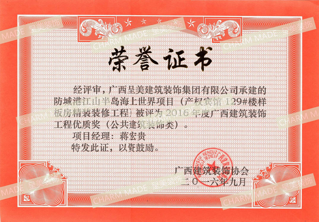 2016年度廣西建筑裝飾工程優(yōu)質(zhì)獎(海上世界項目)